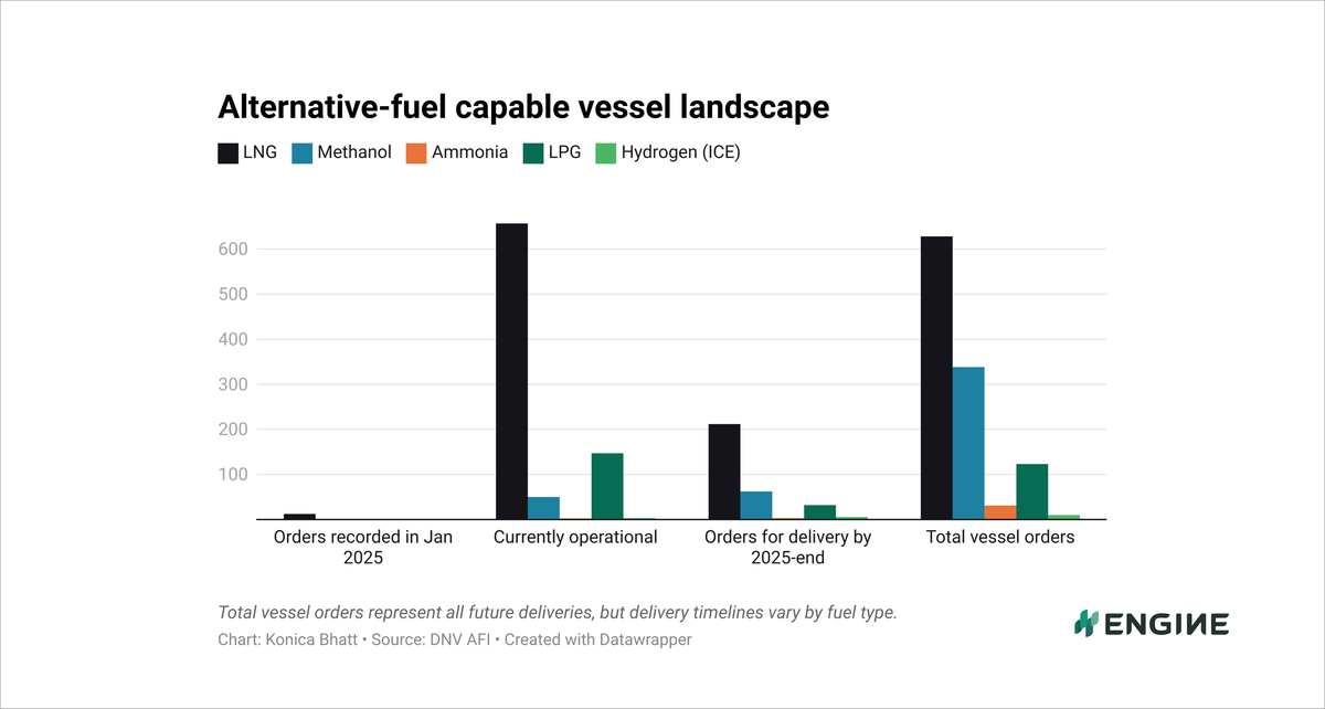 CHART: Alternative-fuelled vessel order landscape in January 2025. ENGINE, DNV
