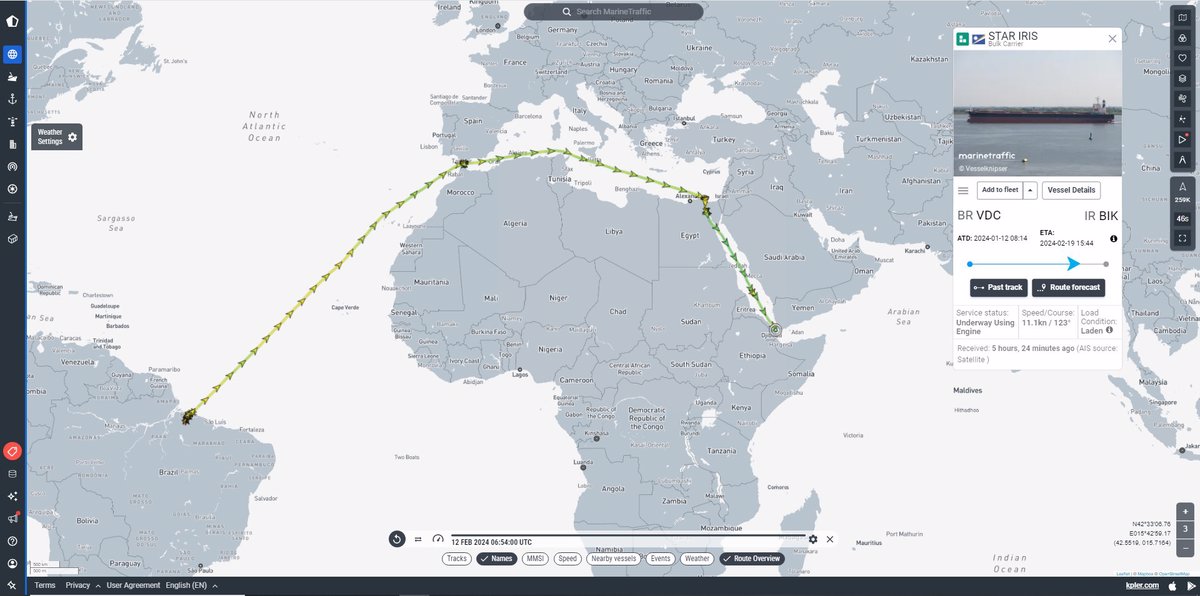 MAP: The Star Iris' route from Brazil via the Gibraltar Strait and Suez Canal, to the Red Sea where it was attacked. MarineTraffic via X