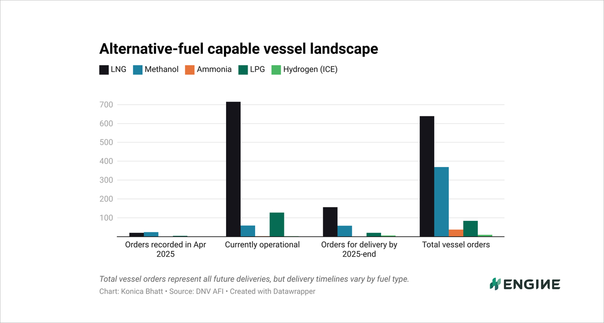 CHART: Alternative-fuelled vessel order landscape in April 2025. ENGINE, DNV