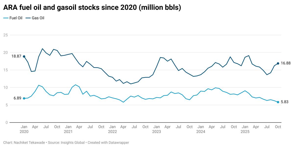 The ARA's fuel oil inventories are now at their lowest monthly average of the year.