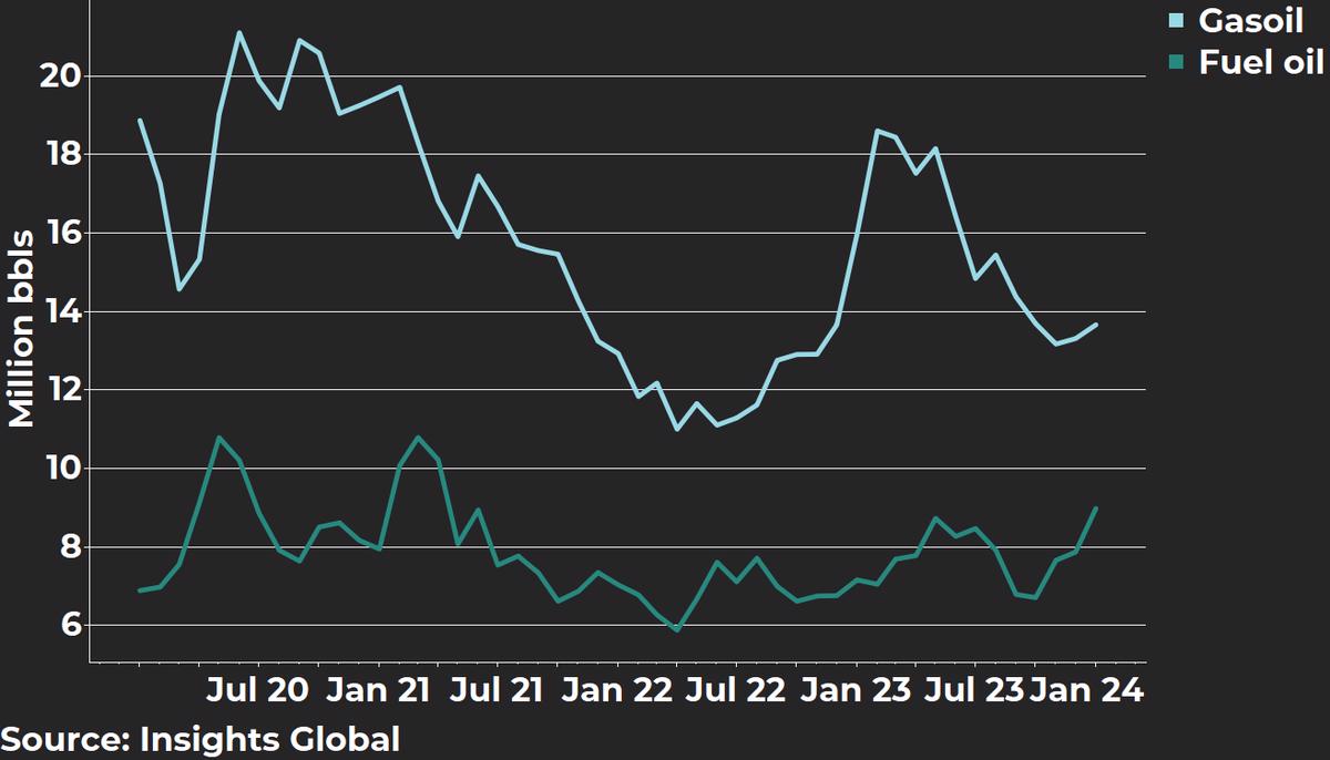 - Fuel oil stocks up 1.11 million bbls to 8.98 million bbls