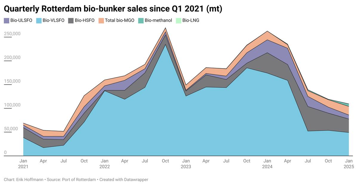 The first quarter of 2025 saw a significant decrease in demand for biofuels sold in the Dutch Port of Rotterdam. The port's bio-bunker sales have more than halved from a peak of 262,000 mt in the first quarter of 2024 and coincided with massive growth in Singapore's sales.