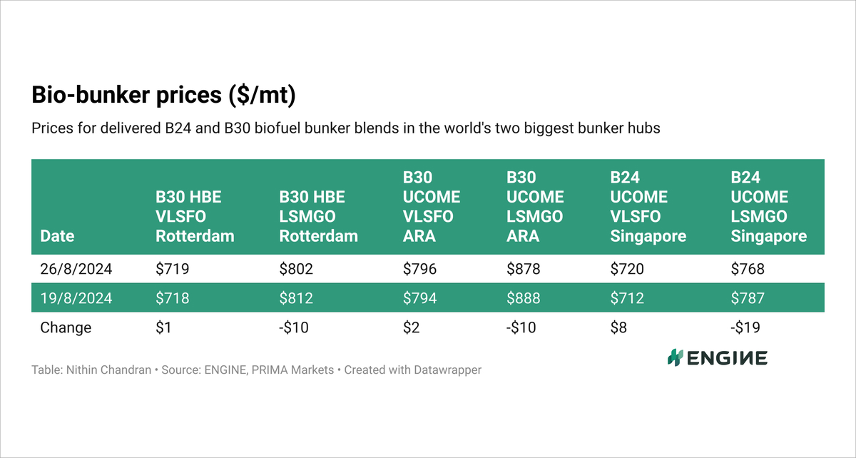 Rotterdam’s B30-VLSFO HBE price has held steady in the past week, while its B30-LSMGO HBE price has come down by $10/mt.