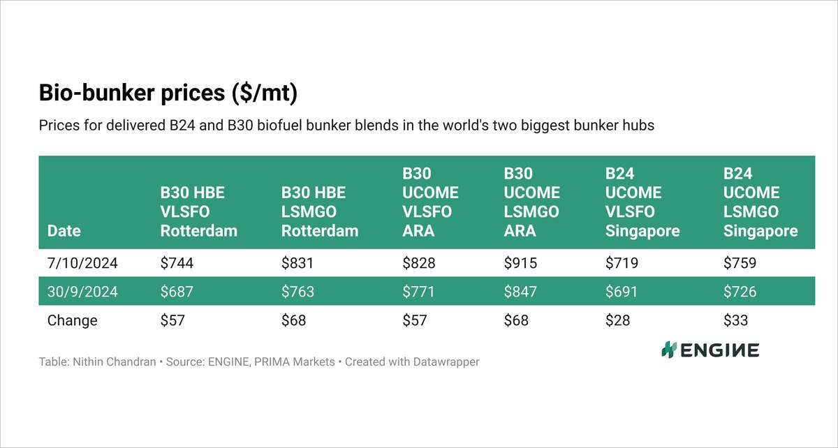 Rotterdam’s B30-VLSFO HBE price has jumped by $57/mt in the past week, while its B30-LSMGO HBE price has risen by a more significant $68/mt.