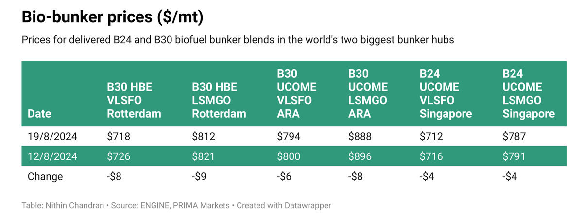Bio-bunker prices in Singapore and Rotterdam decline
