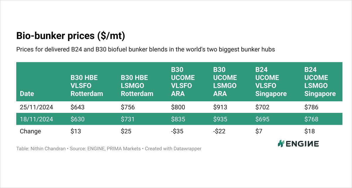 Singapore’s B24-VLSFO UCOME price has risen by $7/mt in the past week, while the B24-LSMGO UCOME price has increased by more than double that amount, climbing by $18/mt.