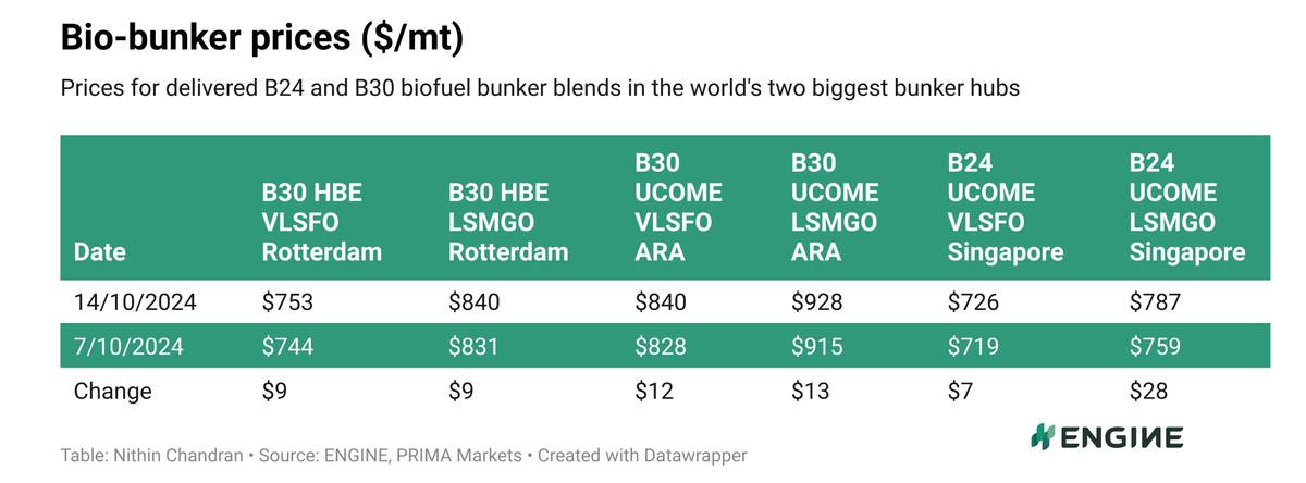Biofuel price premiums over pure conventional fuels are $195/mt for B30-VLSFO HBE blends and $157/mt for B30-LSMGO HBE blends. These premiums have narrowed by $5-6/mt in the past week.
