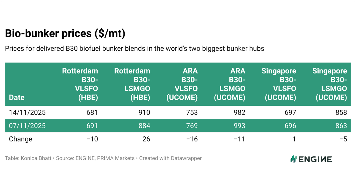 A $14/mt rise in Prima's assessed Dutch HBE rebate for marine B30 blends has added some downward pressure on prices, while a modest $3/mt gain in conventional VLSFO has counterbalanced some of the decline.