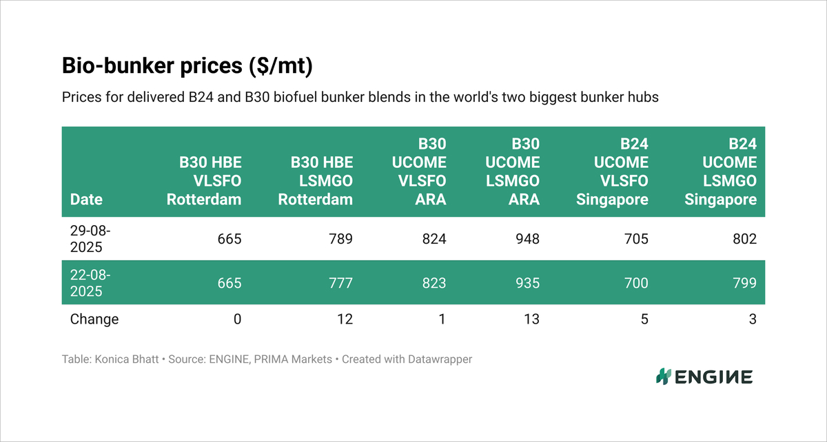 Rotterdam’s trend has largely mirrored the wider ARA market, where UCOME-based B30-VLSFO and B30-LSMGO have increased by $1/mt and $13/mt, respectively, in line with a $12/mt jump in Prima’s UCOME FOB ARA barge price.