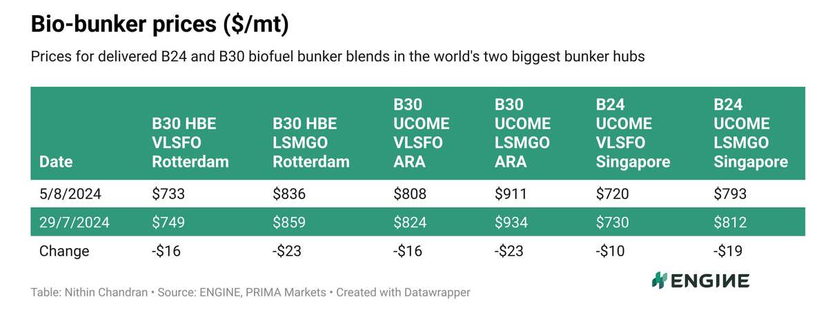 Biofuel Bunker Snapshot: Prices continue to fall in Singapore and Rotterdam