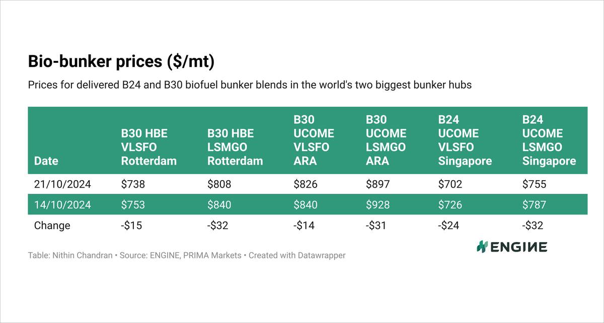 Biofuel Bunker Snapshot: Prices drop in key bunker hubs