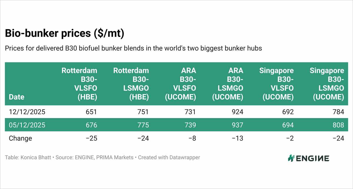 Rotterdam’s HBE-rebated B30-VLSFO and B30-LSMGO prices have fallen by $24–25/mt over the past week. The declines have come amid a $10/mt drop in Prima Markets’ assessed ARA POMEME barge price, along with $9–19/mt declines in conventional VLSFO and LSMGO benchmarks.
