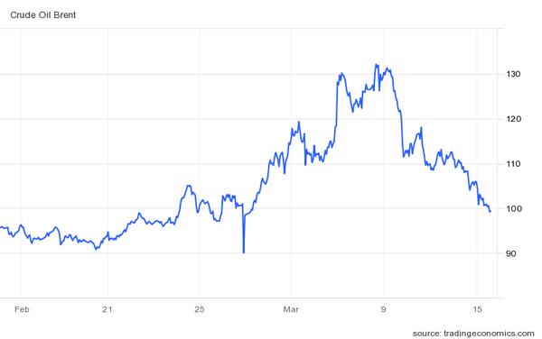 CHART: Brent peaked at intraday levels above $130/bbl on 7-9 March and has since come off sharply. Trading Economics
