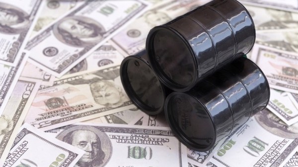 PHOTO: Black barrels of oil placed on US Dollar bills. Getty Images