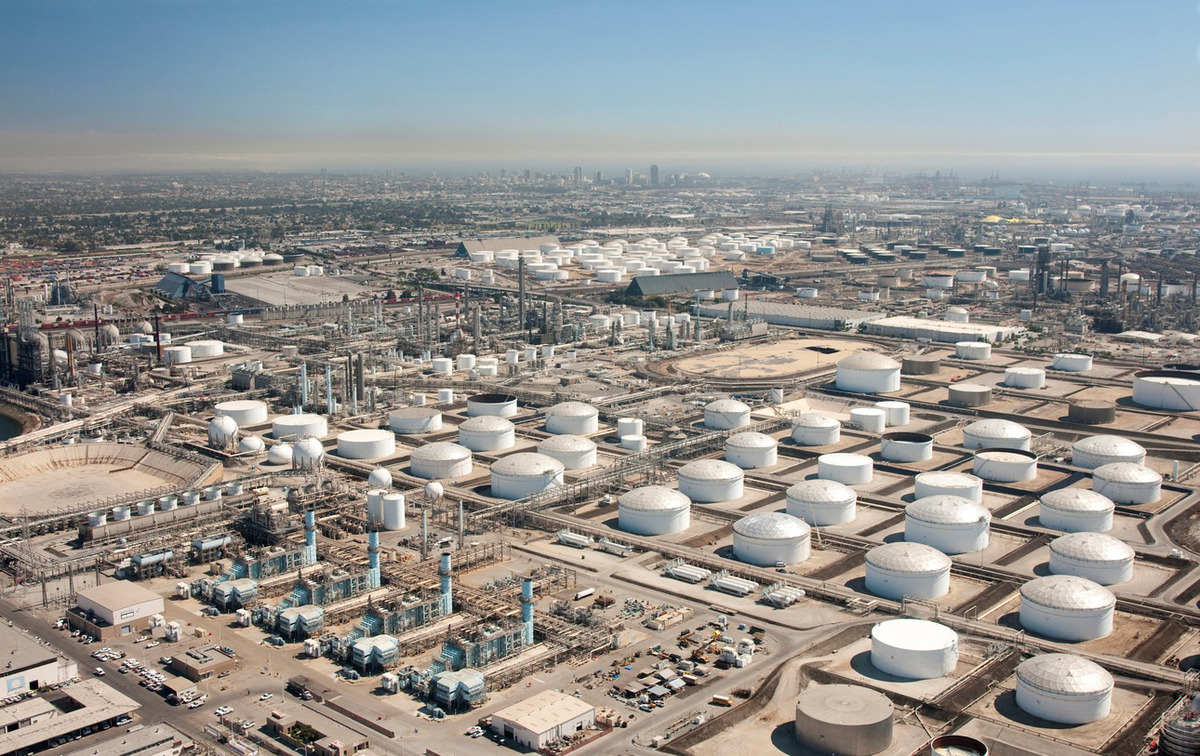 PHOTO: Refinery and oil storage tanks with Long Beach, California in the background. Getty Images