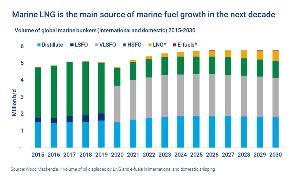 Fuel oil demand from the shipping industry is expected to peak by 2025, while LNG will drive growth in the long-term through displacing nearly 600,000 b/d of fuel oil demand by 2030, consultancy Wood Mackenzie predicts.