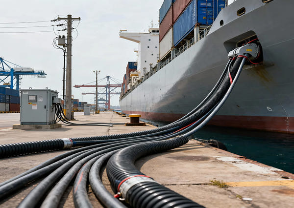 IMAGE: Illustration of a container ship connected to shore power system at a port. ENGINE via Perplexity AI