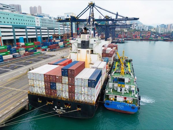 PHOTO: Yang Ming Marine Transport’s containership YM Inception receiving biofuel stem from Chimbusco's bunker barge in Hong Kong. Chimbusco Pan Nation