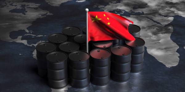 PHOTO: Black drum barrels of crude oil and the Chinese flag on a world map. Getty Images