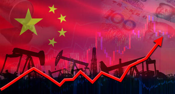 CONCEPT: Crude oil pump jacks with an upward arrow depicting the rise in imports, the Chinese flag in the background. Getty Images