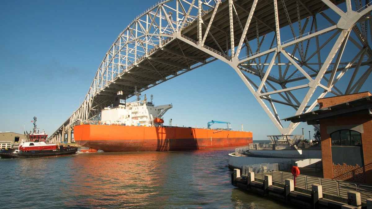 IMAGE: An oil tanker with a tug boat escort under the Corpus Christi Harbour Bridge. Getty Images