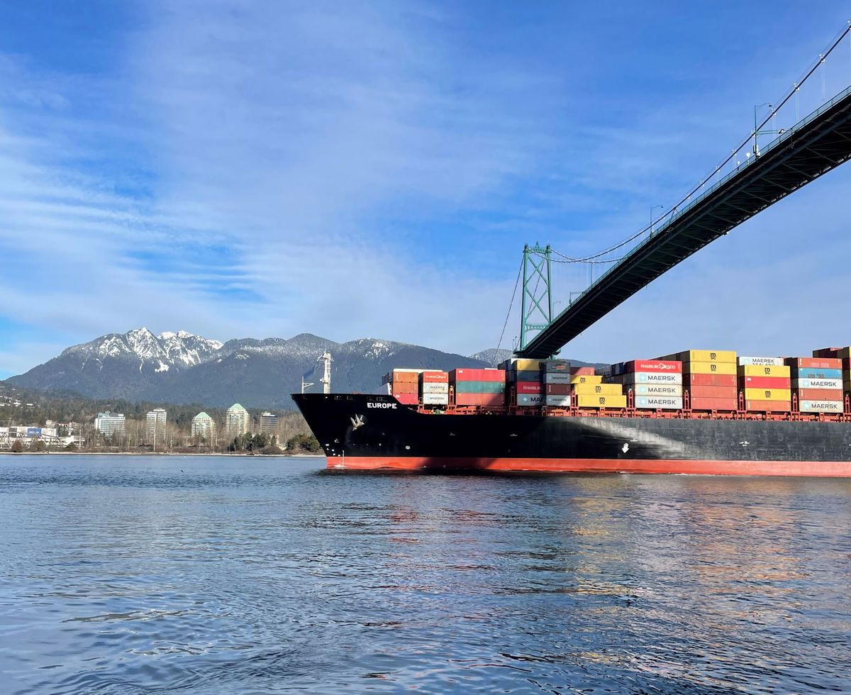 Photo: Danaos Shipping’s 8,468 TEU containership M/V Europe passing under Lions Gate Bridge in Vancouver. Danaos Shipping