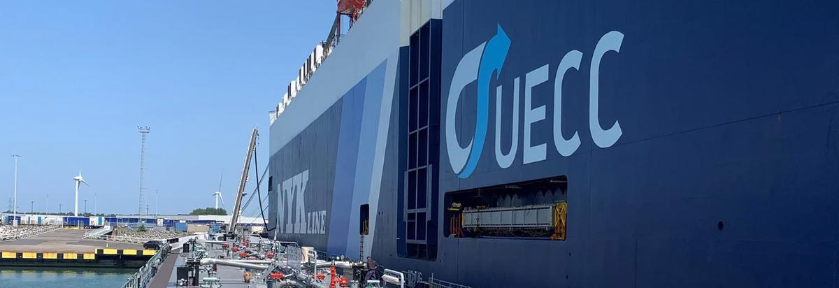 PHOTO: The UECC time-chartered Emerald Leader being bunkered with a B30 biofuel blend in Vlissingen, Netherlands. GoodFuels