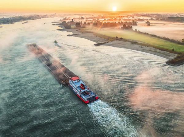 PHOTO: A pusher tug bringing six raw material filled barges for thyssenkrupp Steel to Duisburg. thyssenkrupp