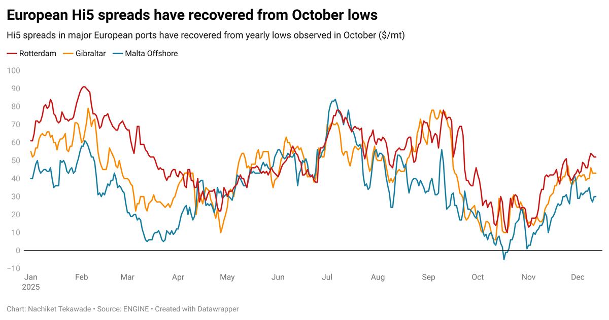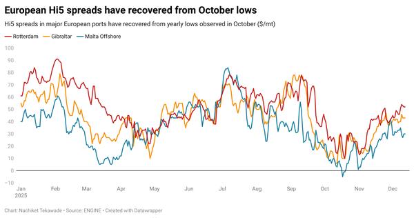 Despite “slow” demand in Singapore, VLSFO lead times remain unpredictable at 4–12 days, little changed from last week’s 4–11 days. HSFO now requires 7–10 days of advance notice, up from 3–9 days previously. LSMGO remains readily available, with suppliers advising 5–8 days of lead time, slightly longer than 3–7 days last week.