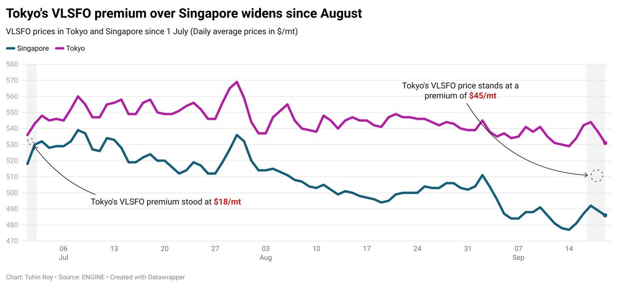 In Japan, Tokyo continues to price VLSFO at elevated levels, carrying a $45/mt premium to Singapore.