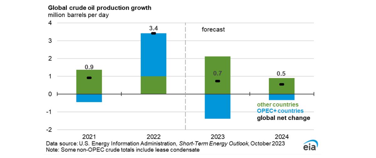 Global liquid fuels production, which includes crude oil and other liquids, will grow by 1.3 million b/d in 2023 and by 900,000 million b/d in 2024, according to the EIA report.