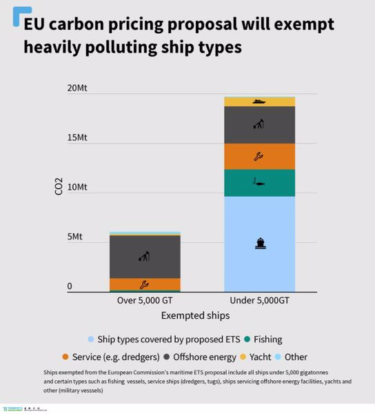 The EU's proposed carbon pricing of maritime emissions applies only to ships above 5,000 mt gross tonnage, leaving the door open to over 25 million mt carbon dioxide emissions, says clean transport NGO Transport & Environment (T&E) in a new white paper.