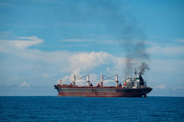 PHOTO: Smoke blowing out of a rusty red cargo ship. Getty Images