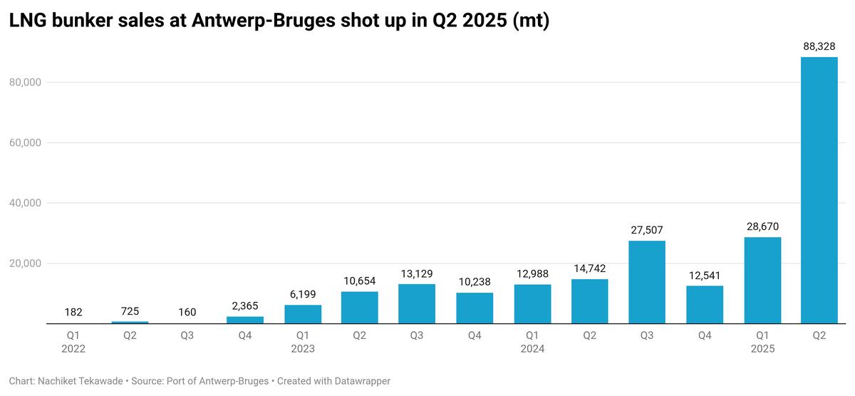 Antwerp-Bruges’ LNG sales have more than quadrupled to 117,000 mt in the first six months of 2025, port authority data shows.