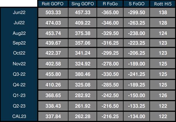 The front-month Singapore FOGO spread ended at -299.50, and the front-month Rotterdam FOGO spread ended at -365.00.