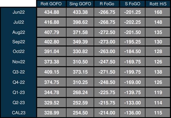 The front-month Singapore FOGO spread ended at -201.25, and the front-month Rotterdam FOGO spread ended at -266.75.