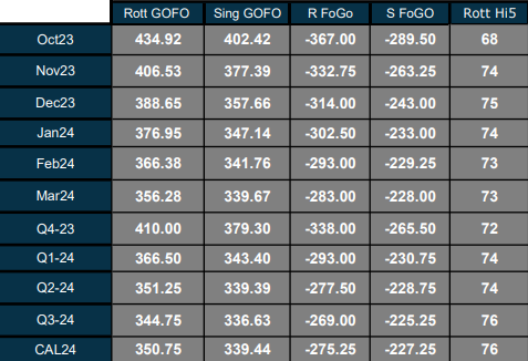 The East-West October HSFO spread has traded in a $2/mt range and narrowed by $0.50/mt from Friday's settlement.