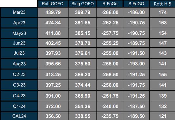 Similarly, Singapore’s March-April VLSFO spread has widened by $1/mt.