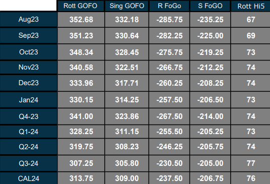 Singapore’s VLSFO crack has strengthened by $0.55/bbl to trade at $9.35/bbl this morning, and Rotterdam’s VLSFO crack has also strengthened by $0.55/bbl to trade at $3.10/bbl.
