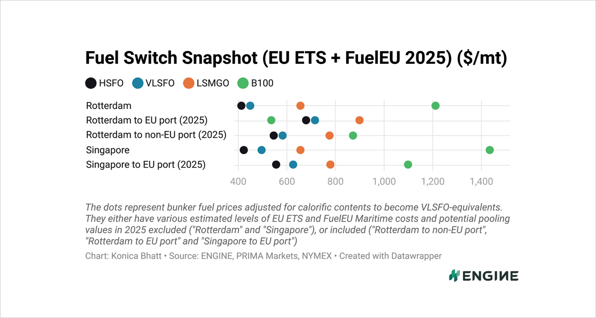 EU regulations mean that B100 can make sense on EU-EU voyages, but not so much on Singapore-EU voyages.