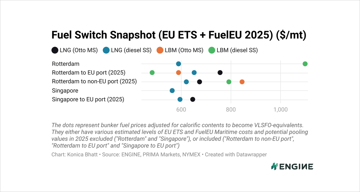 For dual-fuel ships with Otto medium-speed (Otto MS) engines, LNG sits at a $39/mt premium over VLSFO in Rotterdam, and a $20/mt premium in Singapore.