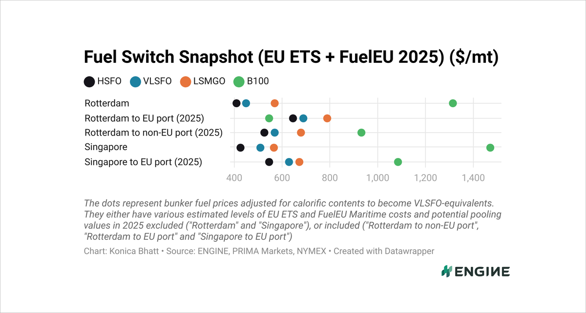 All bunker prices mentioned below have been adjusted for calorific contents to make them VLSFO-equivalent. They have estimated EU-EU voyage compliance costs included for Rotterdam, and non-EU-EU compliance costs included for Singapore. These account for EU ETS costs and FuelEU Maritime penalties, and our estimated compliance surplus values for FuelEU pooling. Rotterdam's B100 and LBM prices also factor in Dutch HBE rebates for advanced liquid and gaseous biofuels sold in the Netherlands.