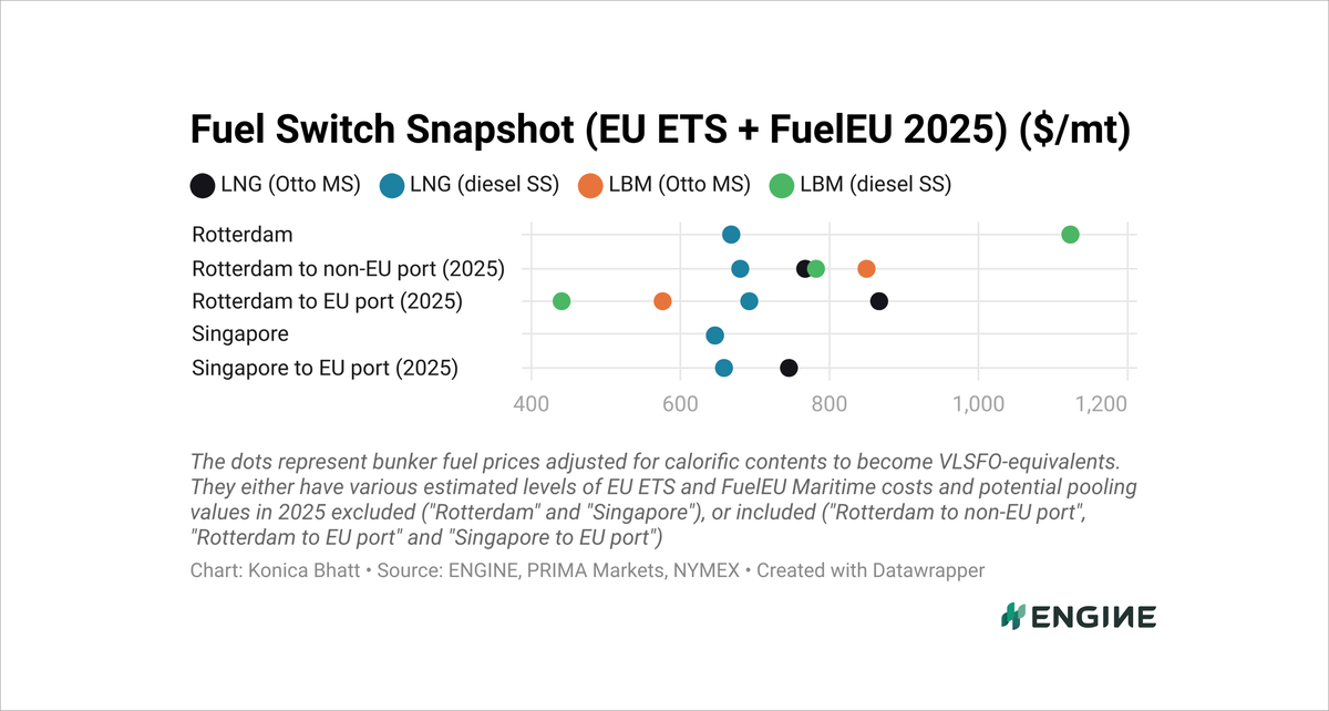 All bunker prices mentioned below have been adjusted for calorific contents to make them VLSFO-equivalent. They have estimated EU compliance costs for EU–EU voyages included. These account for EU ETS costs and FuelEU Maritime penalties, and our estimated compliance surplus values for FuelEU pooling. Rotterdam's B100 and LBM prices also factor in Dutch HBE rebates for advanced liquid and gaseous biofuels sold in the Netherlands.