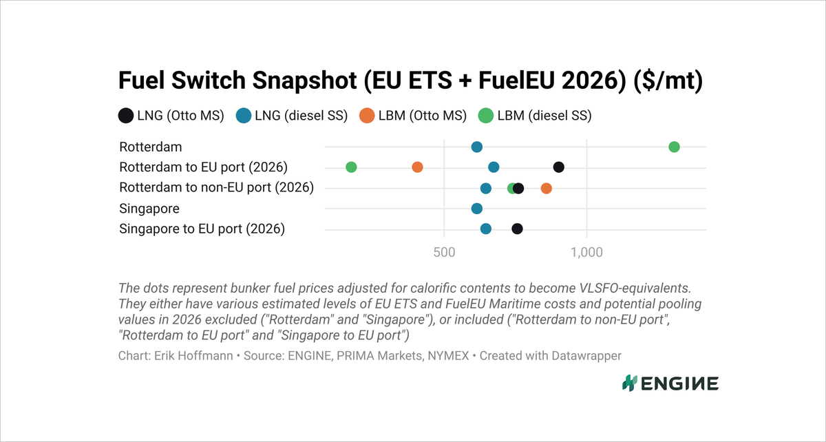 LBM is still the lowest-cost option for EU-EU voyages. 0 gCO2e/MJ LBM bunkered in Rotterdam and consumed in an Otto MS engine is $95/mt cheaper than B100. Consumed in a diesel SS engine, it is $328/mt cheaper.