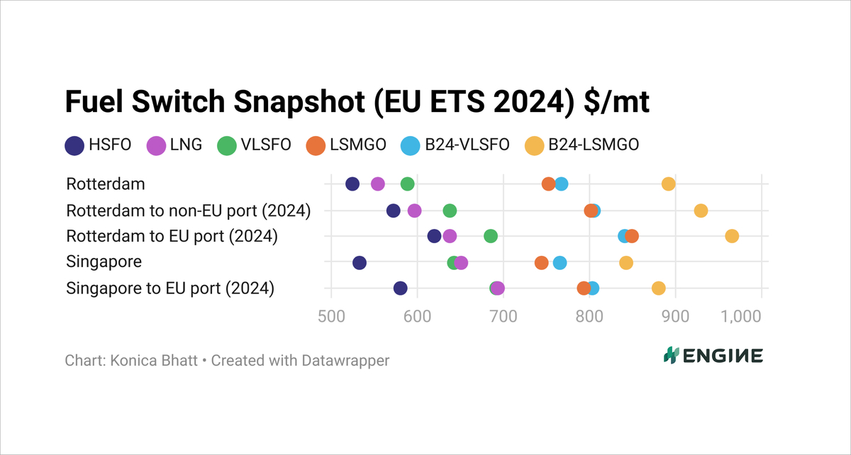 CHART: The dots represent bunker fuel prices adjusted for calorific contents to become VLSFO-equivalents, and with various estimated levels of EU ETS costs in 2024 excluded (Rotterdam) and included (Rotterdam to non-EU port and Rotterdam to EU port). ENGINE, PRIMA Markets, NYMEX