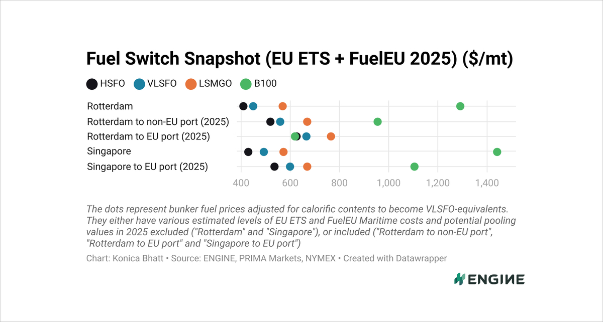 All bunker prices mentioned below have been adjusted for calorific contents to make them VLSFO-equivalent. They have estimated EU compliance costs for EU–EU voyages included. These account for EU ETS costs and FuelEU Maritime penalties, and our estimated compliance surplus values for FuelEU pooling. Rotterdam's B100 and LBM prices also factor in Dutch HBE rebates for advanced liquid and gaseous biofuels sold in the Netherlands.
