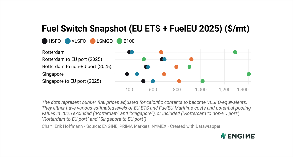 All bunker prices mentioned below have been adjusted for calorific contents to make them VLSFO-equivalent. They have estimated EU-EU voyage compliance costs included for Rotterdam, and non-EU-EU compliance costs included for Singapore. These account for EU ETS costs and FuelEU Maritime penalties, and our estimated compliance surplus values for FuelEU pooling. Rotterdam's B100 and LBM prices also factor in Dutch HBE rebates for advanced liquid and gaseous biofuels sold in the Netherlands.