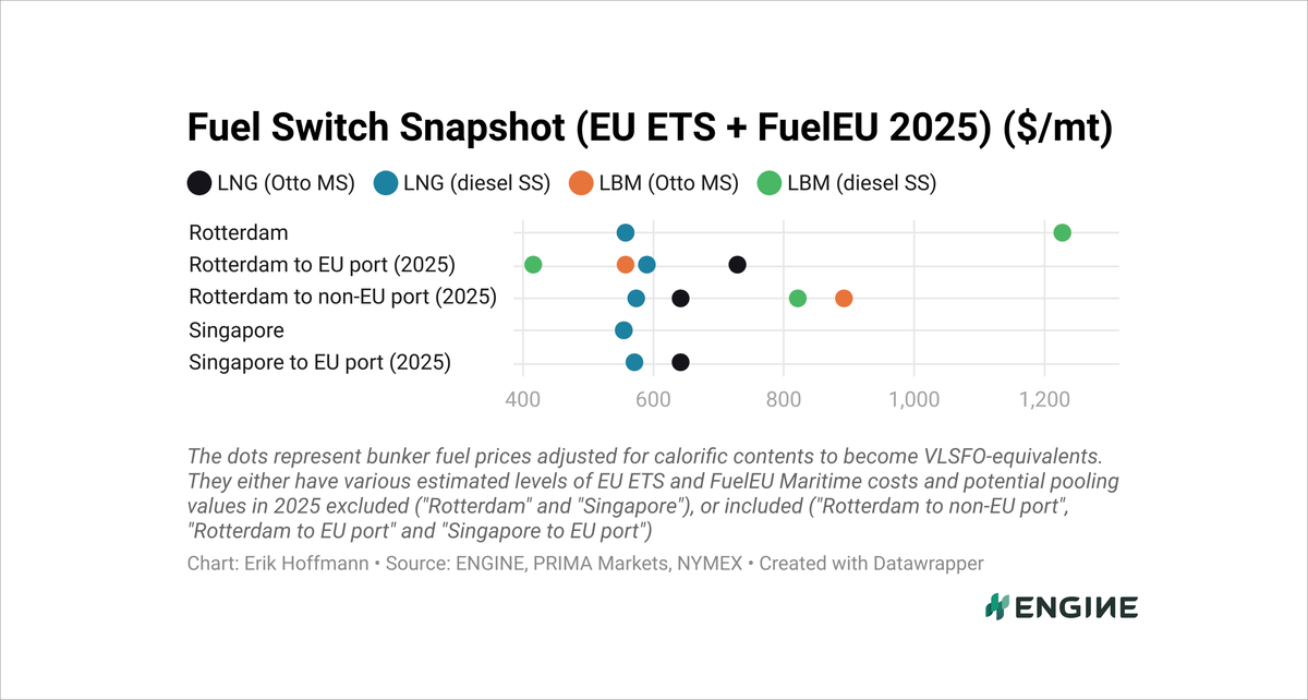 Rotterdam's LNG has risen $26/mt against LBM in the past week. It now holds a $171–175/mt premium over LBM, depending on vessel engine type and its methane slip.