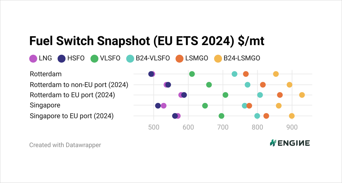 For a ship sailing from Rotterdam to another EU port with estimated EU ETS costs included, LNG retains a $9/mt price advantage.