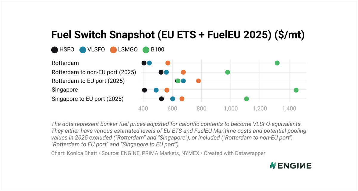 All bunker prices mentioned below have been adjusted for calorific contents to make them VLSFO-equivalent. They have estimated EU compliance costs for EU–EU voyages included. These account for EU ETS costs and FuelEU Maritime penalties, and our estimated compliance surplus values for FuelEU pooling. Rotterdam's B100 and LBM prices also factor in Dutch HBE rebates for advanced liquid and gaseous biofuels sold in the Netherlands.